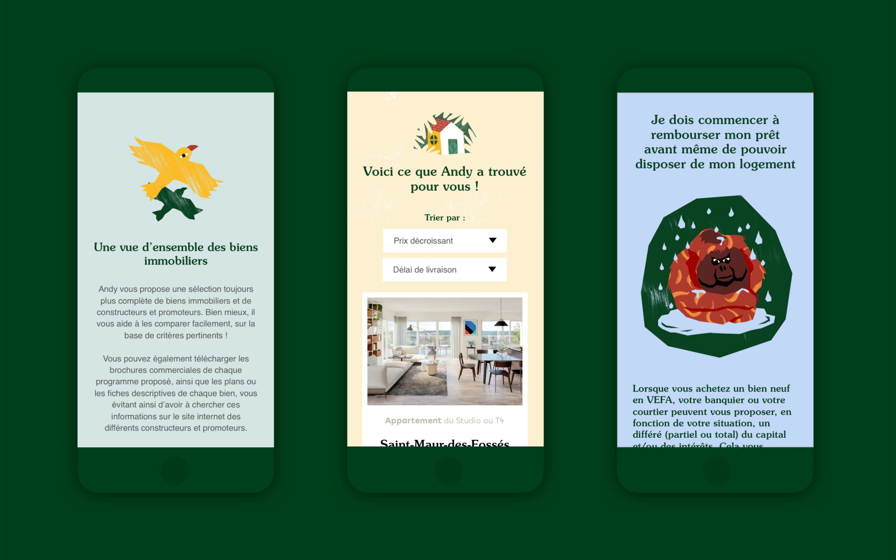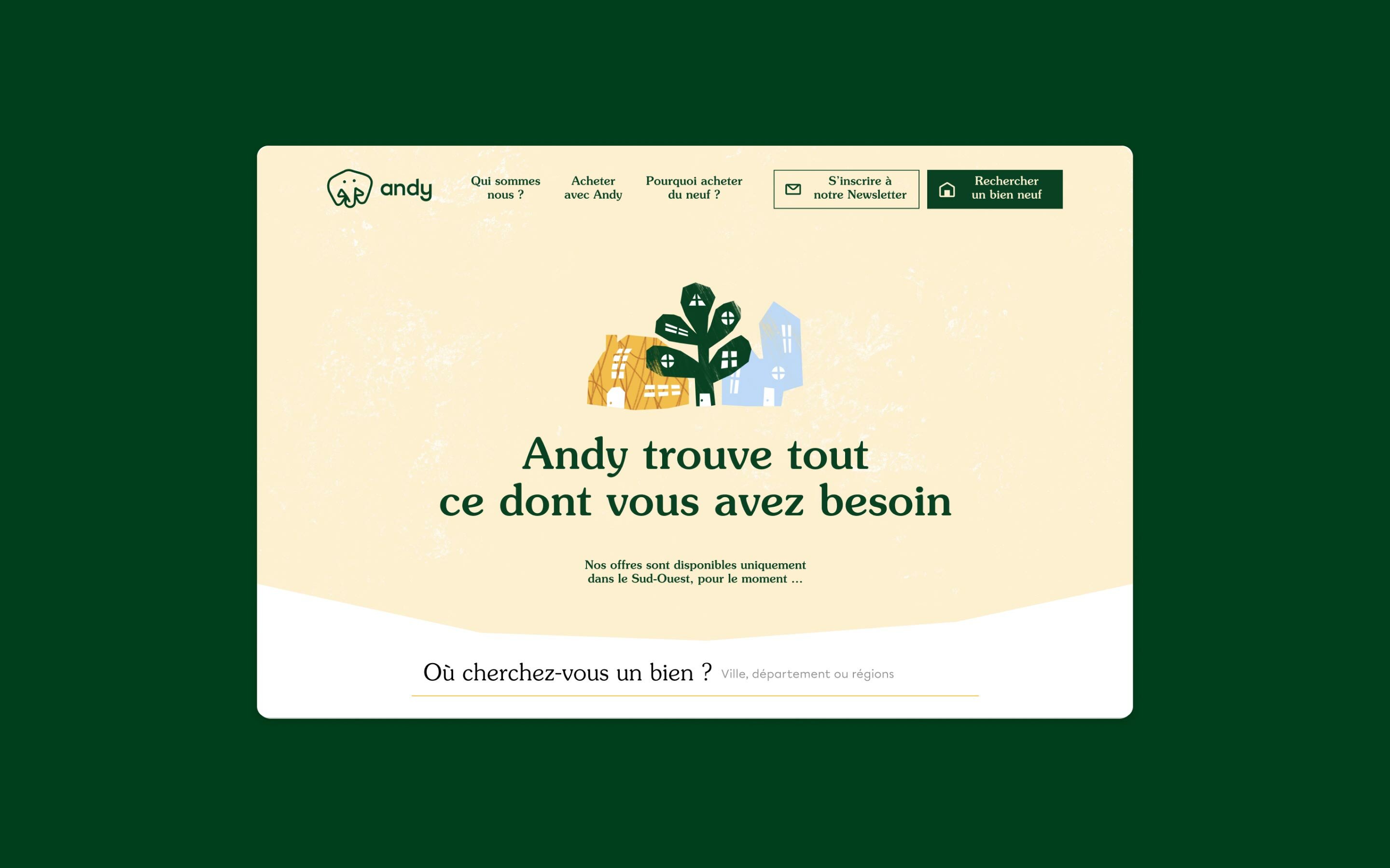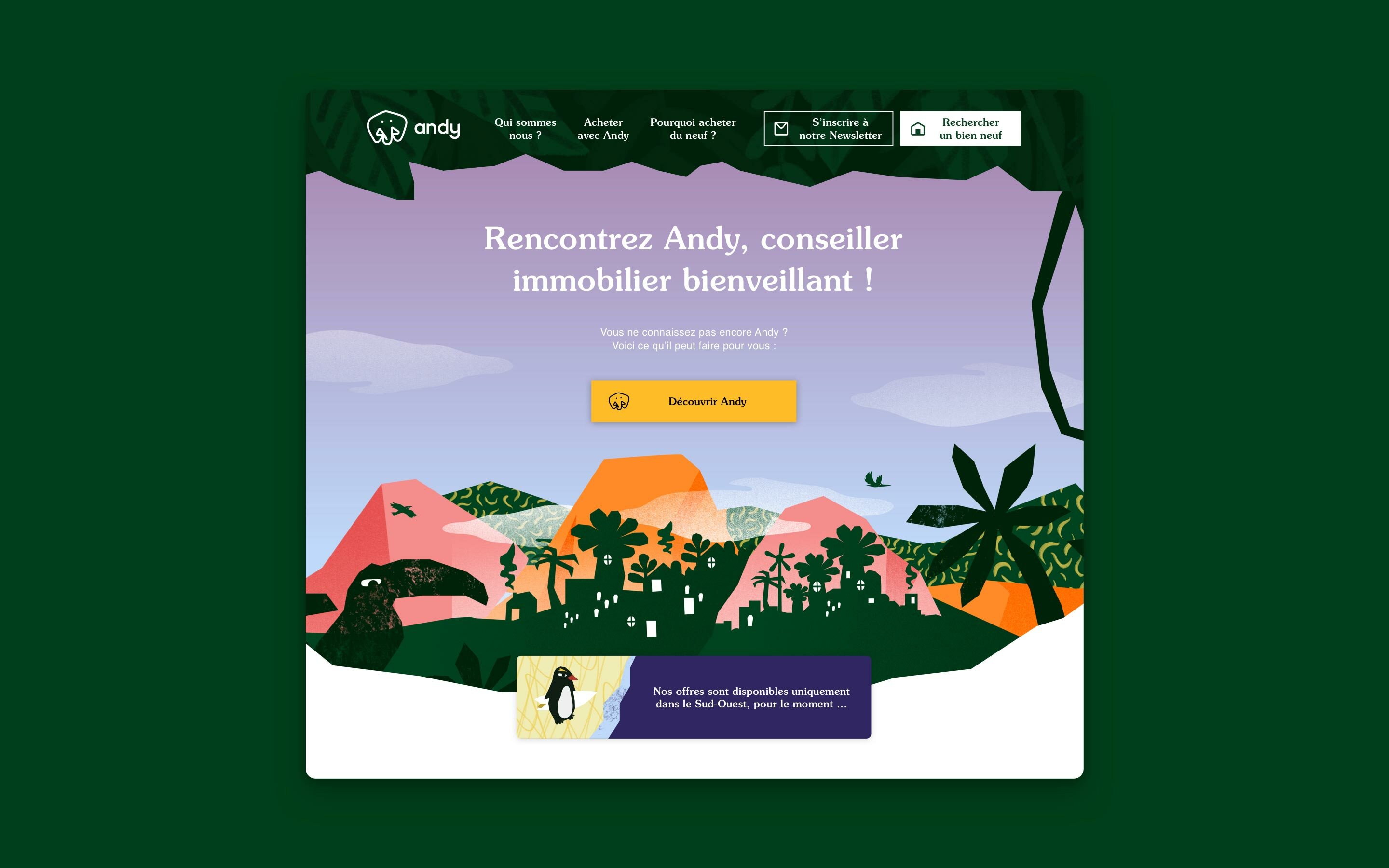 Andy est une start-up en conseil immobilier, qui a pour objectif de renouveler les codes d’un marché vieillissant. Pour cela, Andy mise sur un service simple, des conseils objectifs, et des valeurs fortes : bienveillance, transparence, honnêteté.